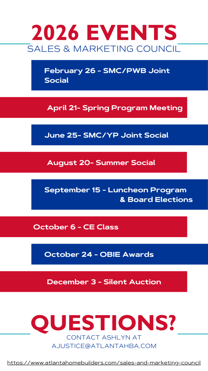 The Atlanta Sales and Marketing Council (SMC) is a 130+ member council comprised of sales and marketing professionals in the homebuilding industry. The council was established in 1980 to enhance the sales and marketing capabilities and reputation of those who represent the HBA. SMC is dedicated to developing a higher level of professionalism in the general membership through education and the exchange of ideas. SMC is dedicated to promoting education, programs, membership, awards and charity.